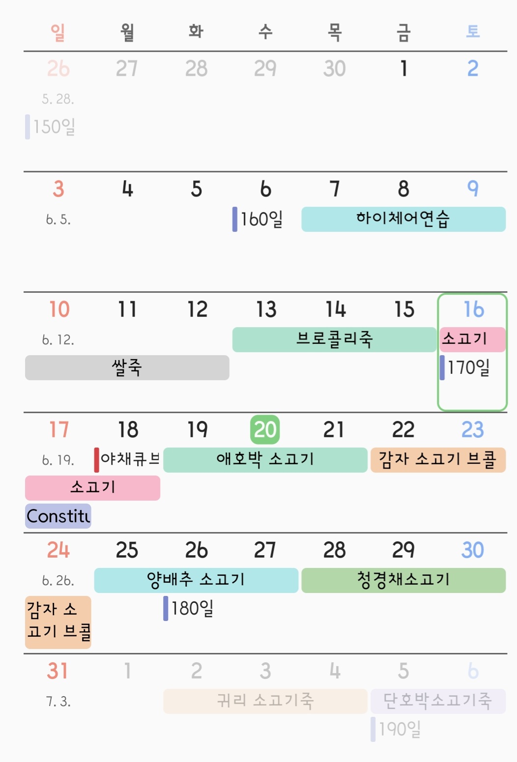 - 180일 이전에 시작했으므로 채소만 넣은 식단도 구성하여 채소 본연의 맛 느끼게 해주기!