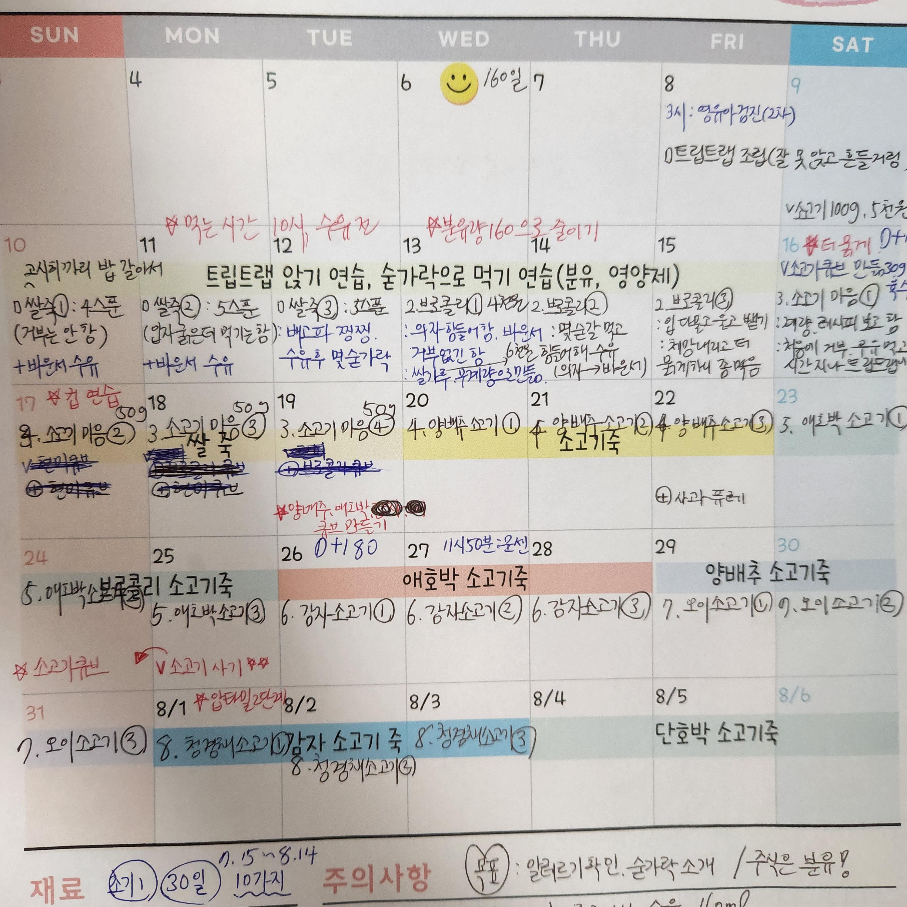 위쪽에는 먹여야 할 식단을 적고 아래쪽에는 식단을 진행 후 아기가 보인 반응을 적었다.