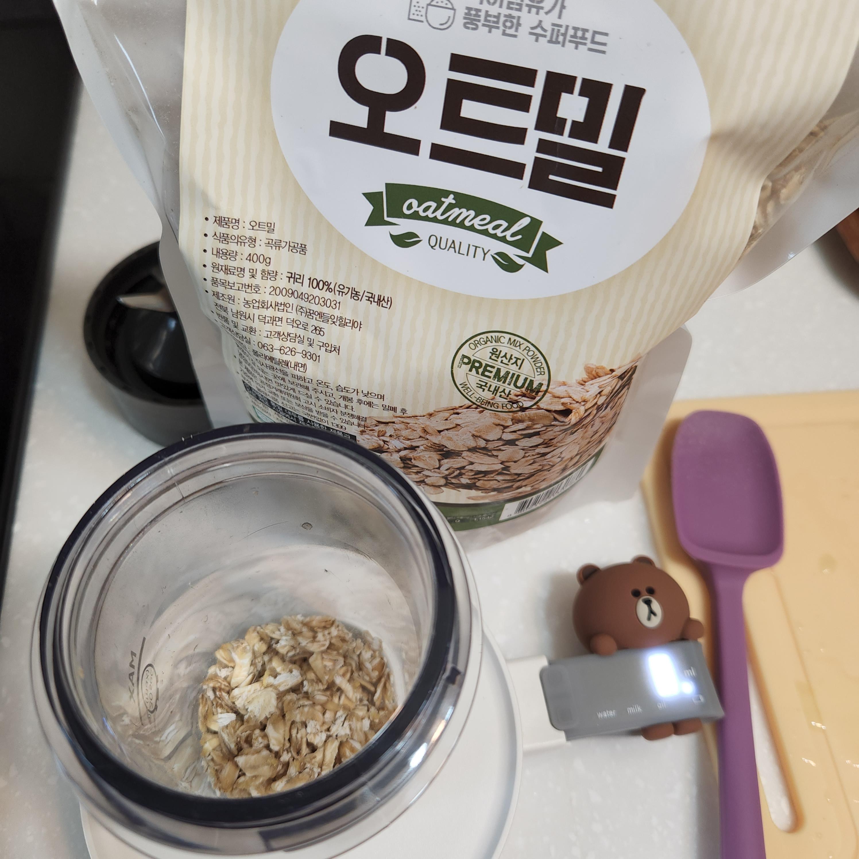 이 때만 해도 그냥 마른 오트밀만 넣고 갈아서 크기가 뒤죽박죽이었는데
